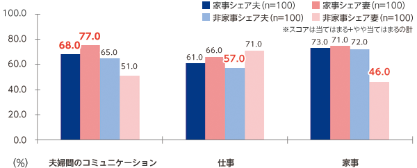 調査対象:全國の30代~40代の既婚男女10000人のうち、配偶者と同居している9700人を分析対象として設定。その中から家事分擔比率が「夫4割:妻6割」、「夫5割:妻5割」、「夫6割:妻4割」である夫婦を家事シェア層とし、それ以外を非家事シェア層と定義した。家事シェア層、非家事シェア層を男女別それぞれ100人ずつ計400人を集めて調査実施。