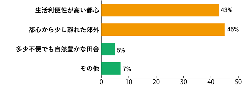 「都心から少し離れた郊外」(45%)と「生活利便性が高い都心」(43%)という、対照的な場所に二分されました。働き方改革によりテレワークという選択肢が増えたものの、実際にテレワークだけで完結できる仕事は少數派なのかもしれません。通勤?通學を考えるとこの2つのエリアに回答が集中するのもうなずけます。