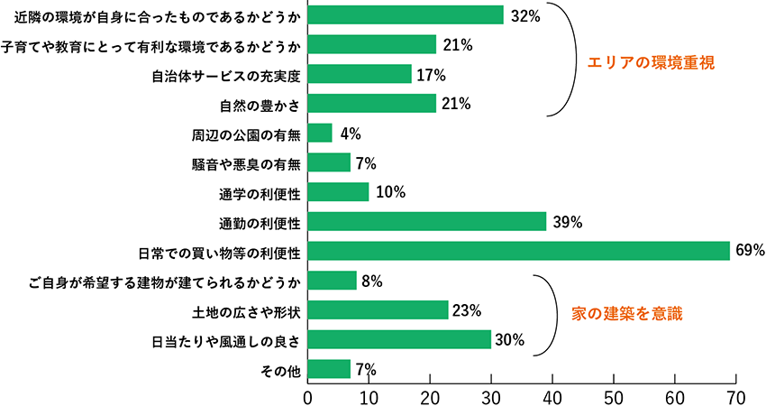 1番目に重視するポイントとしては「日常での買い物等の利便性」(69%)が突出して多く、「通勤の利便性」(39%)が後に続きます。その他、以下二つのグループから、土地探しのニーズが浮き彫りになっています。