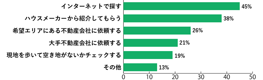 「インターネットで探す」(45%)が最も多く、「ハウスメーカーから紹介してもらう 」(38%)、「希望エリアにある不動産會社に依頼する」(26%)と続きました。 「インターネットで探す」と「ハウスメーカーから紹介してもらう」と回答した方のそれぞれ約4割は、単獨の手段で土地探し?家探しをしていましたが、それ以外は複數の手段を併用して探していることがアンケートから分かりました。