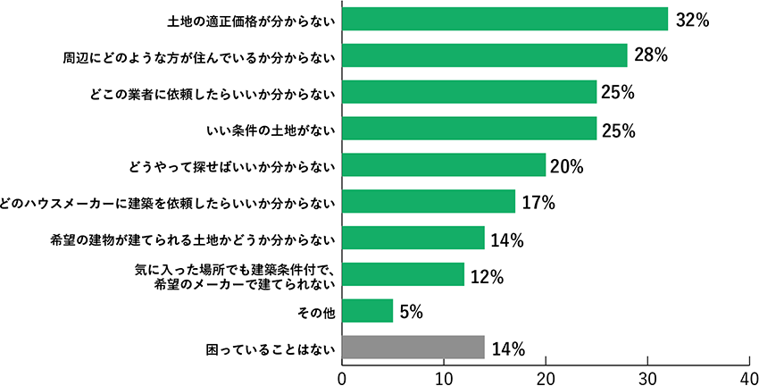 土地探し?家探しでの困りごとについて聞きました。「困っていることはない」(14%)を除いた86%が、何らかの困りごとを感じているという結果に。最も多かったのが「土地の適正価格が分からない」(32%)でした。土地価格のおおよその指標はあっても、土地の形狀や立地條件によって適正価格が分かりにくく、不安を感じる方は多いかもしれません。