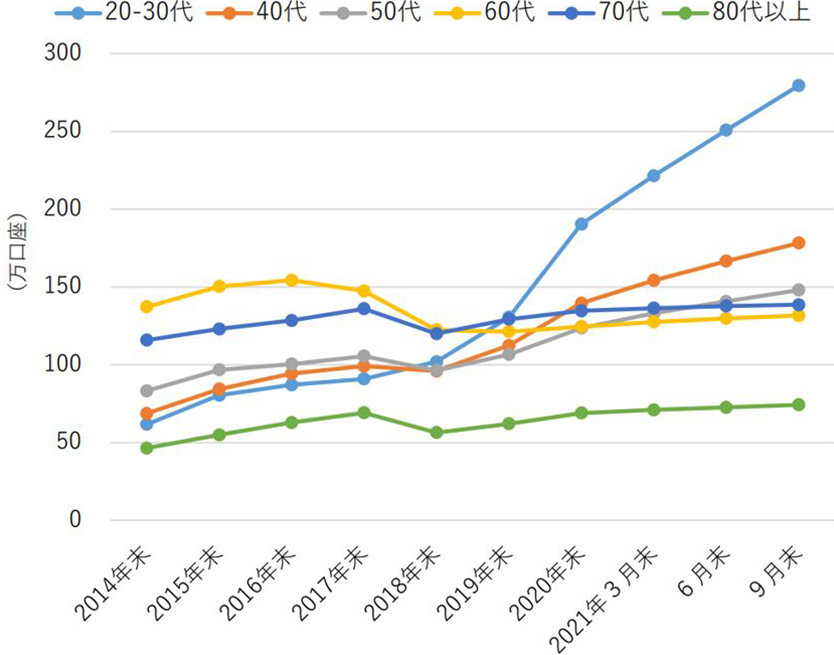 合わせて図2の「年代別NISA(一般?つみたて)口座數の推移」見ると、2019年末から2021年9月末まで連続して20~30代のNISA口座數の伸びが著しいことが分かります。2021年は四半期ごとの口座數がグラフ化されているため、2021年は第三四半期までで前年の2020年末よりも口座數が増えていることが分かります。次いで40代、50代以降も、20~30代に比べると緩やかですが、右肩上がりの伸びを見せています。2019年末以前と比べ、2020年末以降は速いスピードで口座數が増えていることが分かります。この時期は、新型コロナウイルス感染拡大時期と重なっていることから、巣ごもり期間にNISAの証券口座を開設した層が若年層に広がったと言えるでしょう。その一方で、図3「年代別NISA(一般?つみたて)口座數」を見ると、2021年9月末時點でのNISA口座數は20~30代で約280萬口座、40代で約179萬口座です。