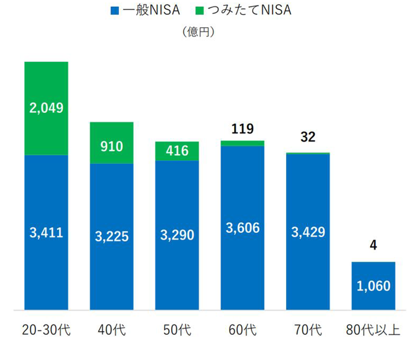 次に図4の「年代別NISA(一般?つみたて)新規買付額の推移」を見ると、20~30代は増え続けていますが、それ以外の年代は2019年末に下がって、2020年末に上がっているものの、翌年では同程度の推移となっています。また、「年代別NISA(一般?つみたて)新規買付額」では、20~30代でつみたてNISAの新規買付額が他の年代よりも多いことが分かります。