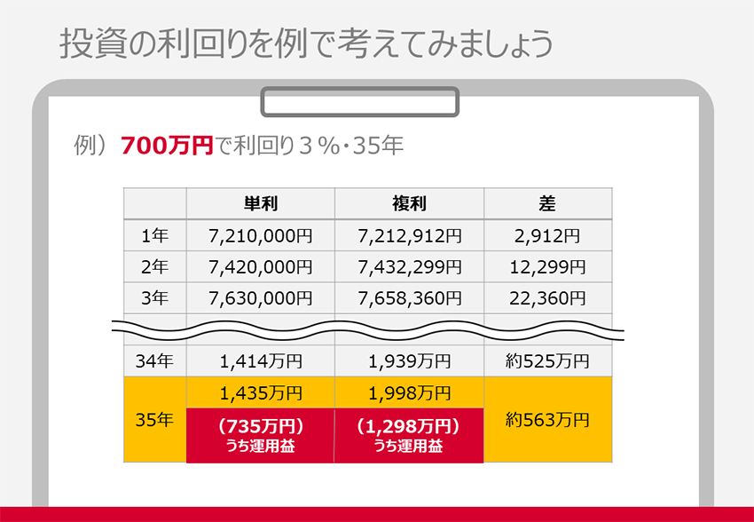 さまざまなシミュレーションを行い、それぞれの選択肢のメリットとデメリットを相談?wù)撙颂崾兢筏蓼筏俊W罱K的に、相談?wù)撙项^金を少なめにして、NISAを利用した投資を行う選択をしました。また、この際の資産運(yùn)用のシミュレーションは過去の投資信託や債券といったさまざまな金融商品の推移を見て利回り1%だった場(chǎng)合、3%だった場(chǎng)合、5%だった場(chǎng)合と複數(shù)のパターンを用意してご提示しました。