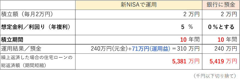 次に、毎月2萬円を10年間貯金した場合にたまった240萬円で、10年後に繰上返済した場合と毎月2萬円を新NISAで運用した場合の金額について比べてみましょう。