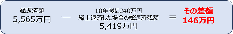 10年後に240萬円の繰り上げ返済で最終的な総返済額は146萬円減額となりました。