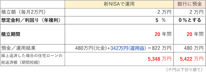 さらに20年間預金した場合、および新NISAで運用した場合の繰上返済の結果は下記の通りです。