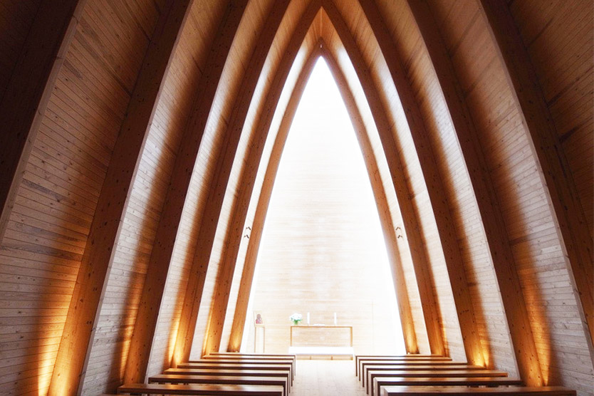 「聖ヘンリー?エキュメニカル禮拝堂」。無塗裝のアーチ狀の木材が奧行きを強調し、奧の祭壇が幻想的に浮かび上がる。