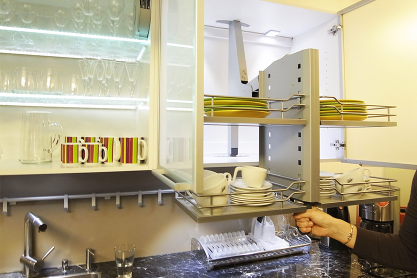 フィンランド人の合理性を重視する國民性は、住まいの中にも見ることができます。フィンランドでは家庭の約8割が共働きのため、夫婦で家事や子育てをシェアしながら合理的に生活する工夫が根付いています。例えば、キッチンには「食器棚兼水切りカゴ」が備え付けられていることがほとんど。食器を洗った後、カゴに濡れた食器を並べるだけで、食器の片付けと水切りが同時に完了する合理的な設備です。食器から滴り落ちた水は、そのままシンクに落ちる仕組みになっています。
