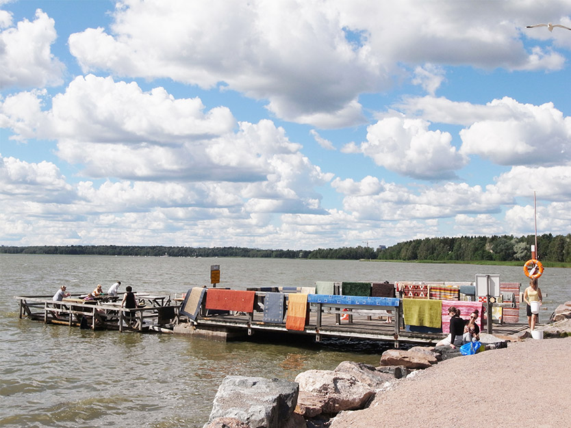 ヘルシンキの海のそばにはマット専用の洗濯スペース「マットライトゥリ」があり、自然分解される洗剤と海水を使って自分でラグを洗います。フィンランドの夏は濕度が低くカラッとしているため、洗ったらそのまま干しておけばすぐに乾きます。この洗濯風景は、夏の風物詩です。