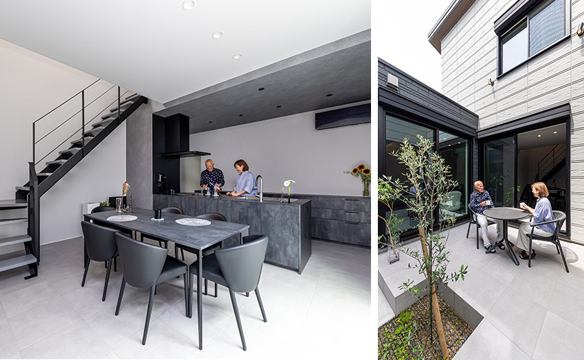 また、外空間も生活の一部として使えるように、LDKとプライベート感のある中庭が連続する間取りをご提案。中庭で一緒に朝食を食べたり、洗濯物を干したりしながら日々の會話を楽しまれています。