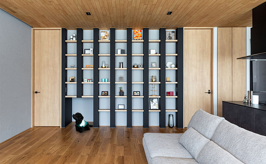 Fさまご夫妻が愛犬と一緒に暮らせる住まいを望んで建てられた、平屋のご新居です。インテリアのセンスとこだわりをお持ちの妻のRさまが、家全體のデザインを考えられました。特にリビングの大きなオープン棚がポイントとなっています。お気に入りの小物がディスプレイされており、住む人の洗練された感性が豊かに表現される空間です。また、リビングに上質感を加えている塗り壁や木目の化粧天井は、素材の知識をお持ちの夫、Kさまが高い関心を寄せられ採用されました。二人がそれぞれの得意分野を擔當され、それらが美的に調和するお住まいです。