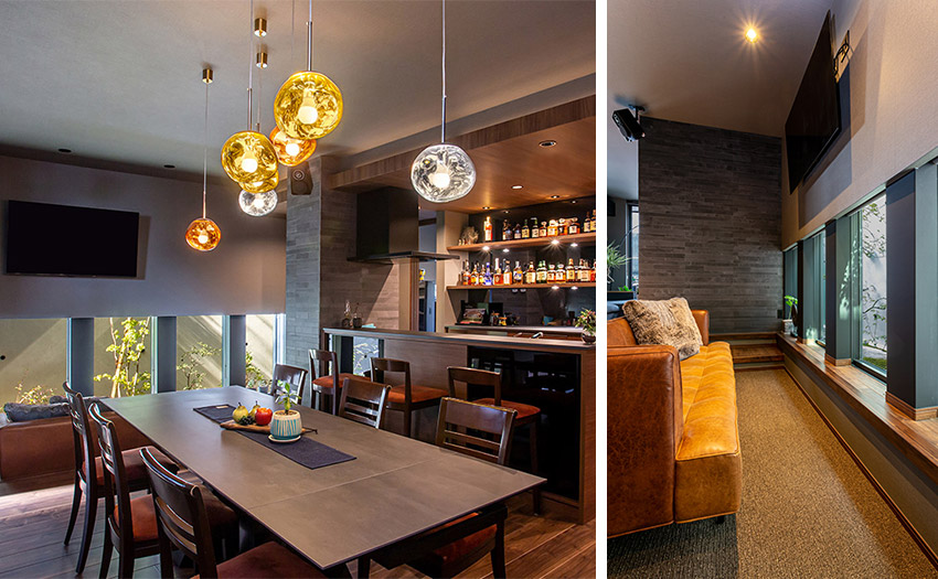 時には友人を大勢招くこともあるという、「隠れ家バー」のような大人の住まいならではのLDK。その一角に、ひとりの時間も心地よく過ごせるスペースをつくっています。窓外の坪庭を眺められるように配置したソファは、大空間の中でプライベートな時間を過ごすことができます。また、床を一段下げて他とゆるやかに仕切ったことで、特別感を演出しています。