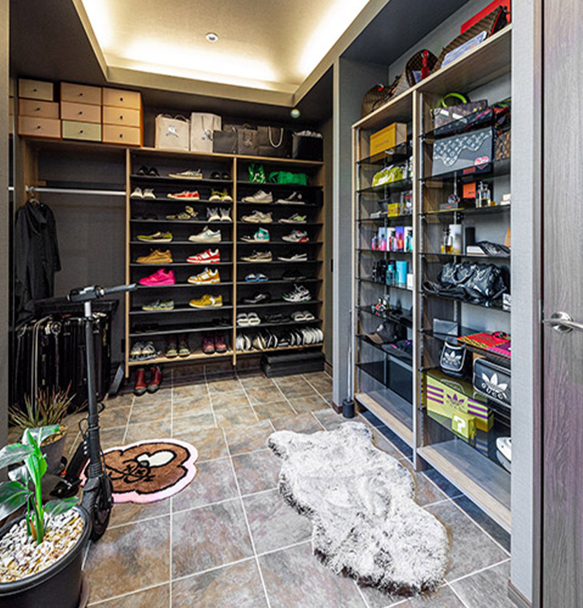 玄関ホールからつながる、ウォークスルーの広々としたクローク。収納の機能性はもちろんですが、間接照明やガラスの棚板など、アパレルショップのようなしつらえにもこだわって、外出前に気分を高めていただけるような空間づくりをしています。お灑落な二人ならではの魅力的なスペースです。