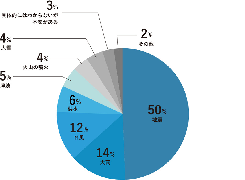 災害に対して「非常に不安」「やや不安」と回答した方の半數が、「地震」が最も不安に思う災害だと回答しました。2位以下の「大雨」(14%)、「臺風」(12%)と大きな差をつけています。