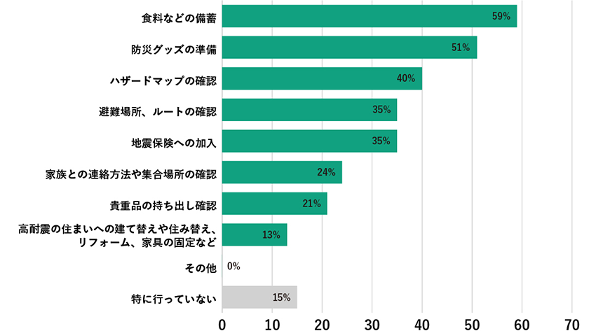 最多は「食料などの備蓄」(59%)でした。インフラが途絶えた狀態でも食べられる非常用食料は、避難生活を送る際の強い味方。次に生活必需品をひとまとめにした「防災グッズの準備」(51%)が2位に。その後に「ハザードマップの確認」(40%)、「避難場所?ルートの確認」(35%)、「地震保険への加入」(35%)と続きます。地震保険に関しては、マイホームを建てたばかりで住宅ローン殘債の多い場合など金銭的なリスクが高い方にはメリットが大きそうです。