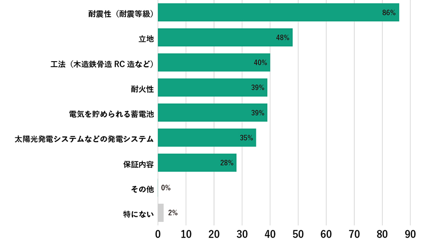 予想通り、「耐震性(耐震等級)」(86%)がダントツの1位となりました。次に「立地」(48%)、「工法(木造?鉄骨造?RC造など)」(40%)、「耐火性」(39%)、「電気を貯められる蓄電池」(同)、「太陽光発電システムなどの発電システム」(35%)と続きました。