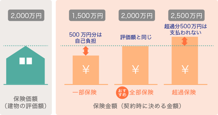 火災保険で大事なのは、建物や家財の評価額と保険金額をそろえること。これを「全部保険」と言います。評価額より高い保険金額を設定する場合を「超過保険」、安い保険金額を設定する場合を「一部保険」と言います。