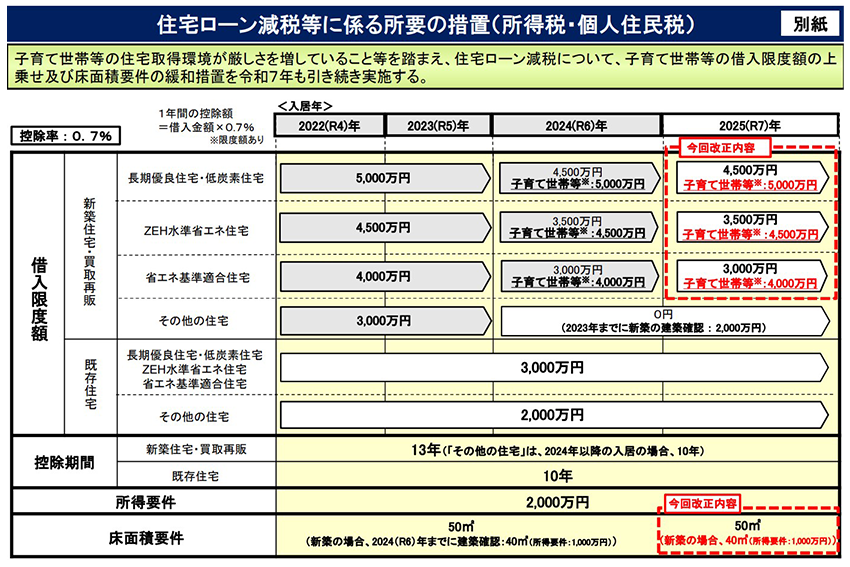 令和6年度稅制改正にも盛り込まれた住宅ローン減稅が令和7年度も延長されることが決まりました。住宅ローン減稅は、「毎年末時點でのローン殘債額 × 0.7%」を所得稅または住民稅から最大で13年間控除を受けられる制度です。子育て世帯には手厚い補償が必要ということもあり、引き続き令和6年度同様の優遇稅制を受けることができるようになりました。この措置は現狀、1年間限りの延長となっています。住宅購入を検討している子育て世帯にとっては大きな支援となるため、利用できる時期を頭の中にいれておくと良いのではないでしょうか。住宅ローン減稅を受けることができる対象の子育て世帯は、19歳未満の子どもを有する世帯または夫婦のいずれかが40歳未満であることです。また控除を受けられる対象の住宅は、長期優良住宅、ZEH水準省エネ住宅、省エネ基準を満たしている住宅で、子育て世帯等の借入限度額の上限はそれぞれ、5,000萬円、4,500萬円、4,000萬円となっています。