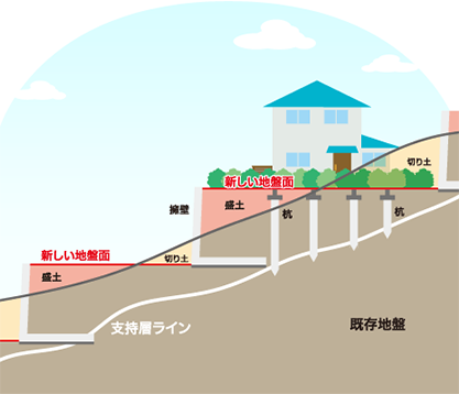 造成時に切り土や盛土をしている場合もあり、地盤の強度が異なる場合があります(支持層ライン)。