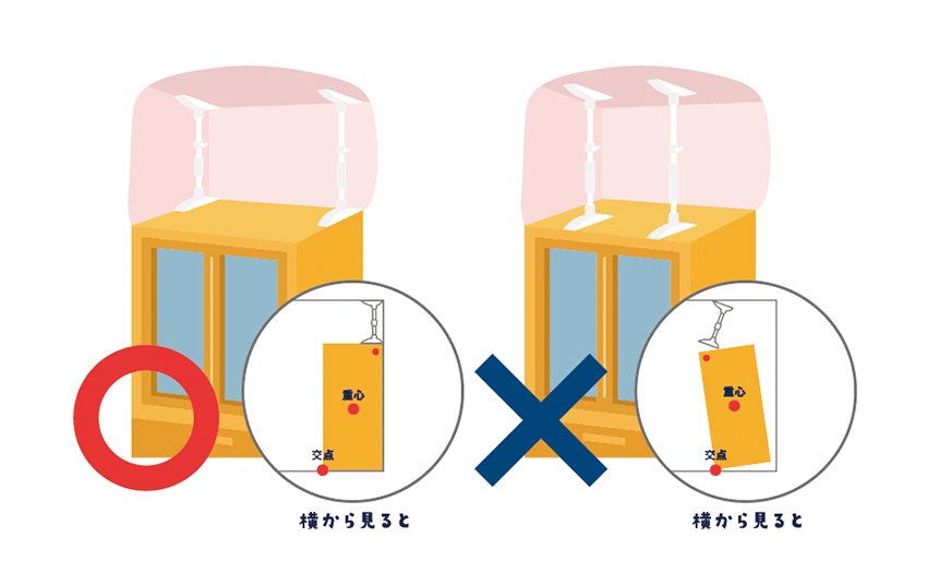配置だけでなく、家具の固定方法にも注意が必要です。まず、しっかりと固定できる強度のある壁かを確認。そして、適切なビスを選びしっかりと固定します。突っ張り棒を使って固定している場合、耐荷重や設置位置が正しくないと効果を発揮しません。家具の天板と天井の間が空きすぎている 、本來は壁の近くに設置 すべきところ、家具の中央や手前側に設置すると、家具が倒れてくる可能性があります。