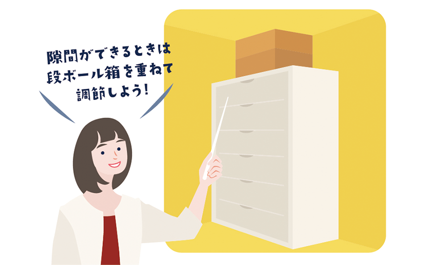 私がおすすめしたいのは、家具と天井の間に段ボール箱を隙間なく置いて「面」で支える方法です。実験では震度6強の地震でも家具は倒れませんでした。見た目が気になるなら、オシャレな収納ボックスを利用したり、マスキングテープなどで裝飾したりするといいですよ!