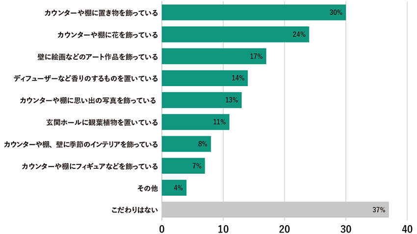 また、「こだわりはない」と答えた方の中には、「砂やホコリが入りやすい場(chǎng)所なのでモノは飾らず掃除しやすいようにしている」と、あえて裝飾性を求めない方もいれば、「棚がないのでモノが飾れない」のように、広さや造りの問(wèn)題で裝飾することを諦めているケースも。