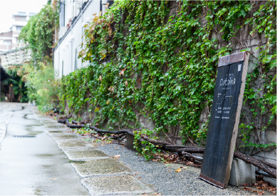 小道沿いにショップが並び、緑に包まれたカフェの奧に入り口がある。