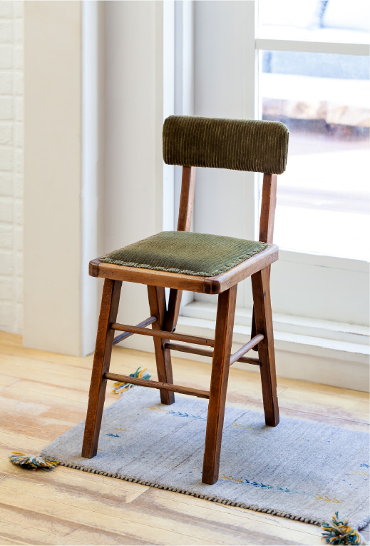 小さくてレトロな風(fēng)合いの木の椅子はユーズド品。「もともと座面と背もたれは木だけだったんですが、雰囲気に合わせてコーデュロイの生地を使ってリメイクしました」。26,000円。