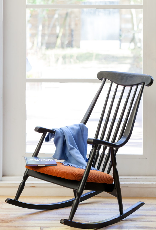 「最近、お問(wèn)い合わせが多いのがロッキングチェアですね。インテリアに合わせて、モダンなオレンジの生地に張り替えました」。ウレタン素材を取り換えて座り心地も増しました。