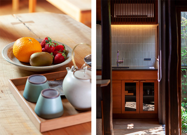 さらにキッチンの備品にも作家の作品がそろいます。茶器やカップ、グラスなどを実際に使うことができるのが魅力。在庫がある限りは購入が可能だそう。「朝食でコーヒーを飲んだ備前焼のカップが使いやすかったのでと、チェックアウトの際にお求めになられたお客さまもいらっしゃいました」