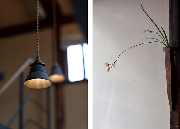 (左)リビングの吹き抜けの天井には伊藤 環さん作のランプシェードを高低差をつけて配置。(右)リビングの柱に生けられた花に癒やされる。花器は森本 仁さん作。
