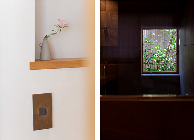 (左)浴室の手前の壁には森本 仁さん作の小さな花器に花を。特注のスイッチプレートで生活感を出さない工夫も。(右)浴室の窓から小庭を見る。空間と開口部のバランスに惹かれる。