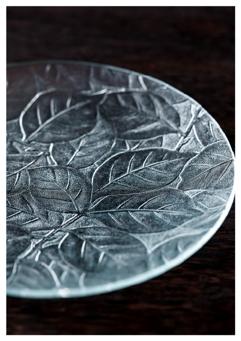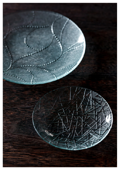 繊細な柄を生かすため、どうしても皿にしたかったという古舘さん。成型のために熱を加えると、肝心の柄が溶けてしまうという難題を、こまめな溫度調節をすることでクリア。実験を重ねながら、皿狀になり、縁の切り口も溶けてテカリが出て、かつ、きちんと柄が殘る溫度域を見つけ出しました。