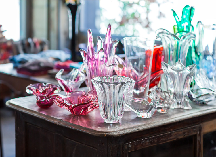 ガラスが並ぶコーナー。「1940年代や1950年代のものも。ヴァル サン ランベールのクリスタルガラスは希少だと思いますよ」。ほかにイタリアの土産物の定番、スノードームなども。