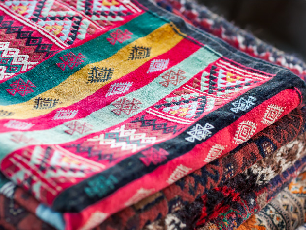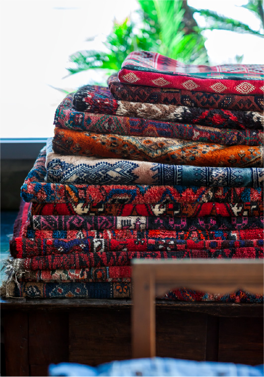 部屋のアクセントになりそうなカラフルなラグは手織りのものを厳選。「ラグは一気に集まることがないので少しずつそろえています」
