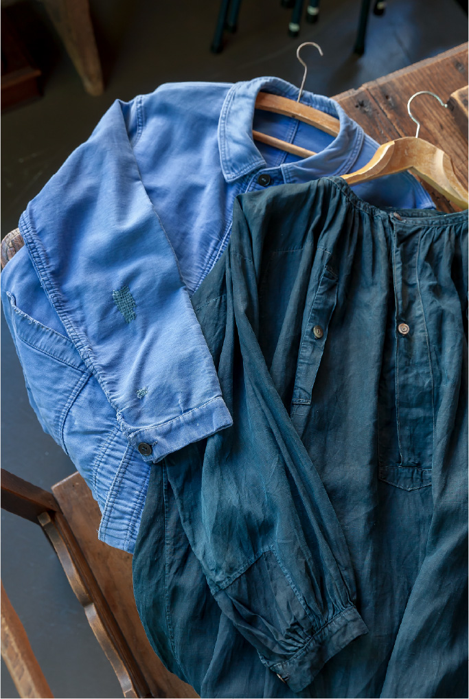 美しいリペアが特徴的なワークウエア。(左)フランスのモールスキンワークジャケット。袖の継ぎも丁寧に施されている。ジャケット17,900円。(右)1920?30年代のアンティークものも!手縫いのボタンホール、インディゴリネンの継ぎも素敵。インディゴリネンスモッグ79,900円。