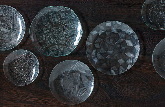 使いやすいシンプルな皿。左上から時計回りにイタリア、オランダ、オーストリアのもの、各2,500円、皿の下のクロス1,900円。
