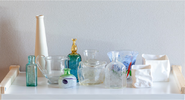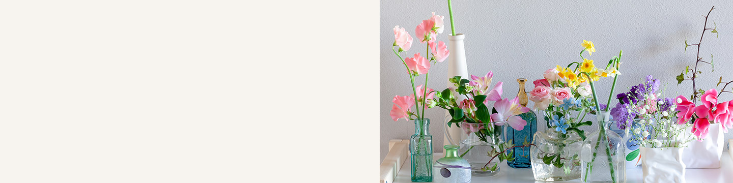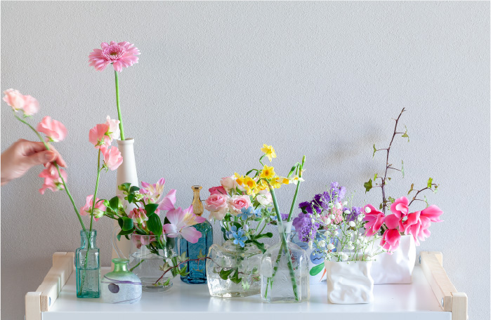 花器選びも楽しみの一つ。ガラスや白ですっきりとまとめたり、カラフルな花器を一つアクセントに加えたりと、コーディネートで遊んで。