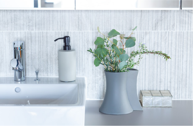 サニタリースペースに小さな花や植物があると有機(jī)的な空間に。目を引くので、何かと小物が多い雑然とした雰囲気をカバー。