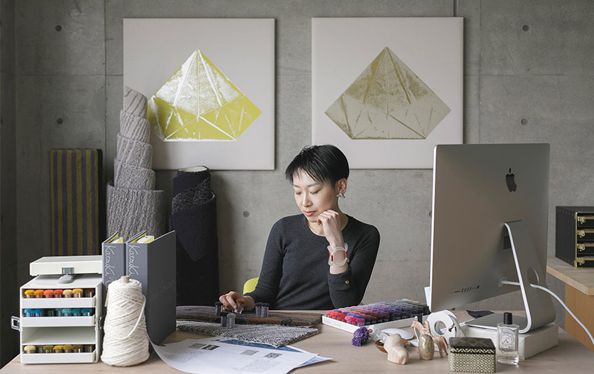 テキスタイルデザイナー?香月裕子さん、東京アトリエ&ショールームにて。そばに置いた箱の中は、ウールの色見本。オートクチュールの配色は何百色の中から選ぶそう。壁のアートパネルは2017コレクションの作品。