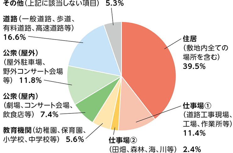 実は発生場所は住居が最も多く、次が道路(歩道含む)、その次が屋外駐車場や野外コンサート會場等となっています。住居には室內以外に庭?ベランダなども含まれ、室內での熱中癥対策が十分でなかったことや、庭やベランダだからと熱中癥への注意を怠ったことなどが考えられます。
