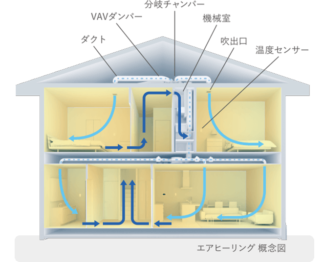 エアヒーリングは、住まい全體の快適性などを重視する方におすすめ。機械室で溫度調節された空気を、送風ファンダクトを通して、各室や行き渡らせるシステムです。また、家族一人ひとりの過ごし方や體質に合わせて、各部屋の溫度をコントロールしたり、人がいない部屋の運転を控えめにして、冷暖房費の削減も行ったりできます。