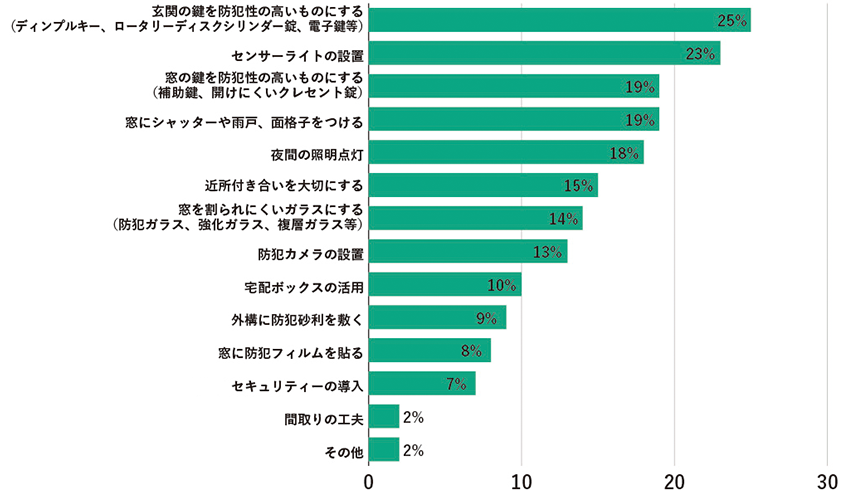 最も多かったのは「玄関の鍵を防犯性の高いものにする」(25%)でした。次に「センサーライトの設置」(23%)、「窓の鍵を防犯性の高いものにする」(19%)、「窓にシャッターや雨戸、面格子をつける」(同)など、侵入されやすい玄関や窓周りの物理的な対策が上位を占めました。