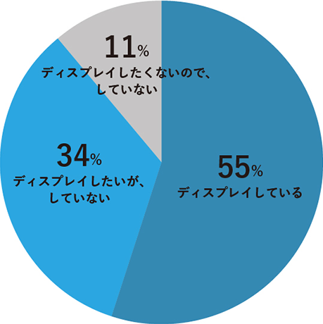 まず、ディスプレイの実態を探るべくQ1の質問を伺うと、「ディスプレイしている」(55%)と回答した人は半數以上でした。「ディスプレイしたいが、していない」(34%)も合わせると、9割近くが屋內にディスプレイを「したい」と考えていることが分かりました。
