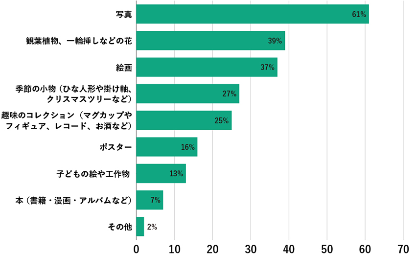 自宅をディスプレイしている方に伺うと、最も多かったのが「寫真」(61%)で全體の3割近くを占める結果に。子どもやペット、孫の寫真や、風景寫真を飾っているという回答が寄せられました。
