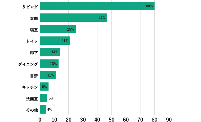 他にも、「寢室」(25%)、「トイレ」(21%)、「廊下」(14%)、「ダイニング」(13%)と続きました。その他、「階段途中の壁」「和室」という回答も寄せられ、さまざまな場所を飾ってお部屋の雰囲気づくりをしているのが伝わります。