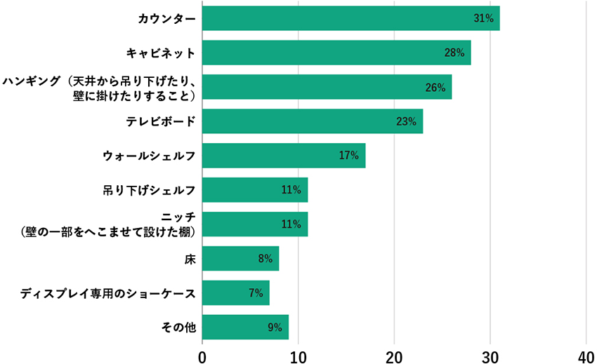 続いて、具體的にどのような方法でディスプレイしているのかも伺いました。最も多いのが「カウンター」(31%)でした。キッチンや玄関などに設けることが多いカウンターですが、作業臺として使う以外にも、飾るスペースとして重寶している様子です。