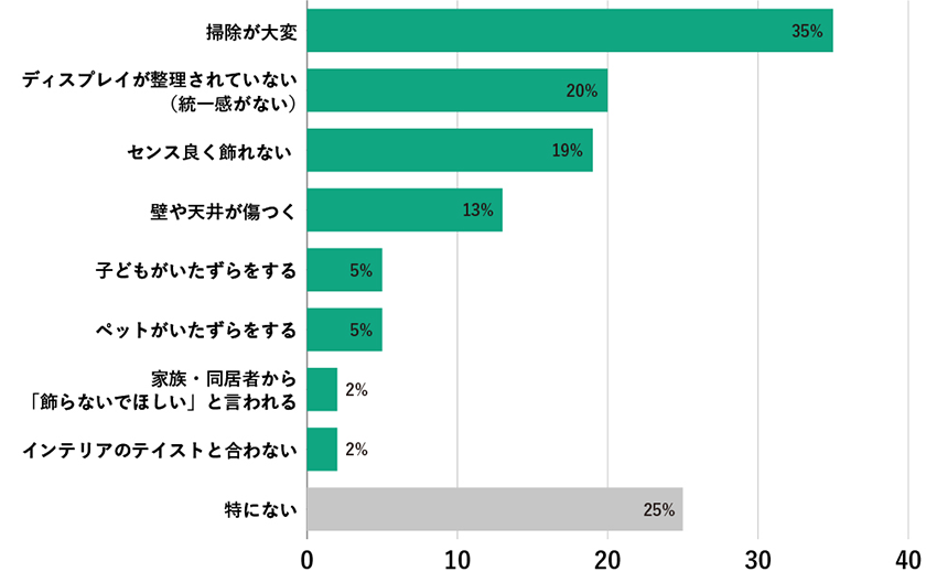 他に多かったのが、「ディスプレイが整理されていない(統一感がない)」(20%)、「センス良く飾れない」(19%)といった「センスに自信がない」といった悩み、「壁や天井に傷がつく」(13%)といった聲も寄せられました。
