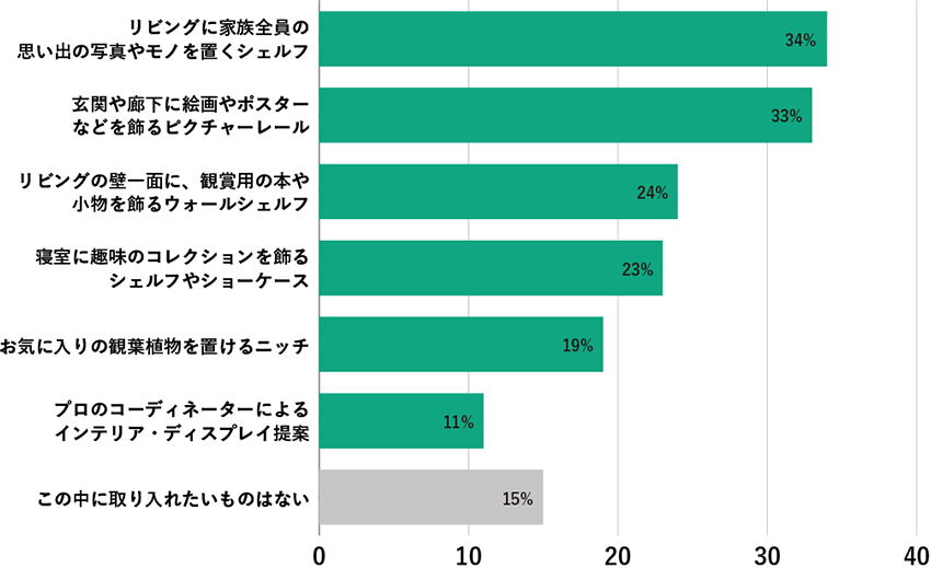 回答を見ると「リビングに家族全員の思い出の寫真やモノを置くシェルフ」(34%)、「玄関や廊下に絵畫やポスターなどを飾るピクチャーレール」(33%)を筆頭に、「リビングの壁一面に、観賞用の本や小物を飾るウォールシェルフ」(24%)、「寢室に趣味のコレクションを飾るシェルフやショーケース」(23%)と続きました。